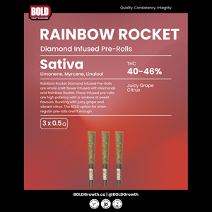 Rainbow Rocket Diamond Infused Pre-Rolls are whole craft flower infused with Diamonds and Rainbow Rocket. These infused pre-rolls are high potency with a rainbow of sweet flavours. Bursting with juicy grape and vibrant citrus. The BOLD option for when regular pre-rolls aren’t enough.
