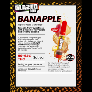 BOLD GLAZED Banapple packs big clouds of smooth, fruity sweetness with a fusion of juicy apple and creamy banana. Just like the song that gets stuck in your head, this sativa cart delivers a vibrant mix of mellow and bright fruit flavours, creating a nostalgic yet refreshing experience you’ll want to hit on repeat. This vape contains high levels of THC with limonene, caryophyllene, and myrcene.